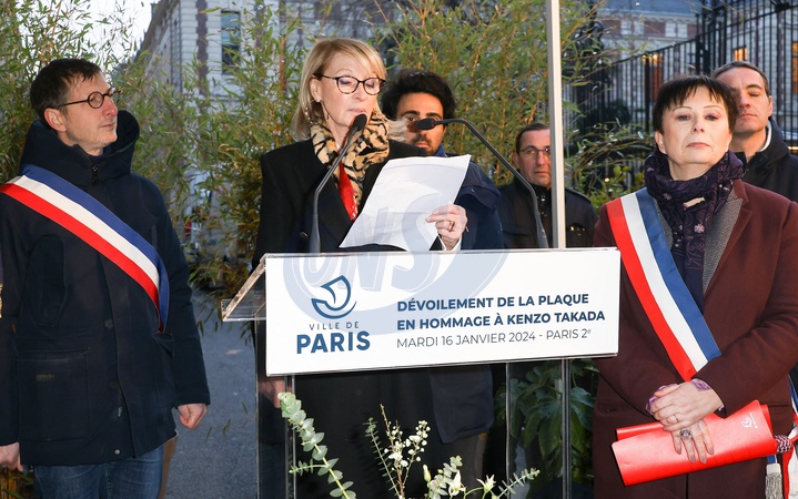 Dévoilement d'une plaque en hommage à Kenzo Takada saluant l'héritage du créateur japonais décédé en 2020 devant la Galerie Vivienne à Paris