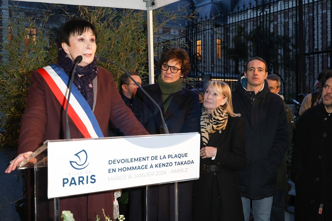 guest, Inès de La Fressange, Ruth Obadia - Dévoilement d'une plaque en hommage à Kenzo Takada saluant l'héritage du créateur japonais décédé en 2020 devant la Galerie Vivienne à Paris le 16 janvier 2024. © Coadic Guirec/Bestimage Unveiling of a plaque in tribute to Kenzo Takada saluting the legacy of the Japanese designer who died in 2020 in front of the Galerie Vivienne in Paris on January 16, 2024.