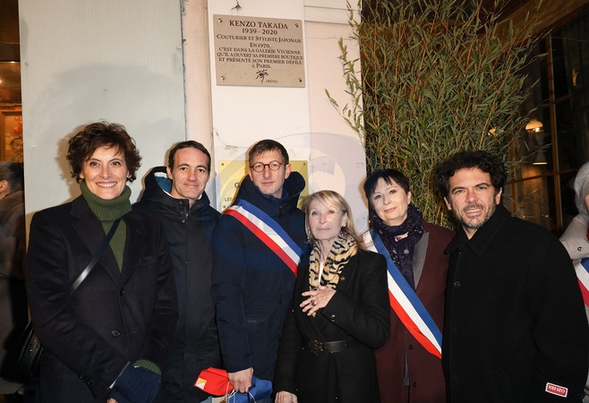 Inès de La Fressange, guest, Ariel Weil, Ruth Obadia, guest et Sylvain Blanc (directeur de la maison Kenzo) - Dévoilement d'une plaque en hommage à Kenzo Takada saluant l'héritage du créateur japonais décédé en 2020 devant la Galerie Vivienne à Paris le 16 janvier 2024. © Coadic Guirec/Bestimage Unveiling of a plaque in tribute to Kenzo Takada saluting the legacy of the Japanese designer who died in 2020 in front of the Galerie Vivienne in Paris on January 16, 2024.