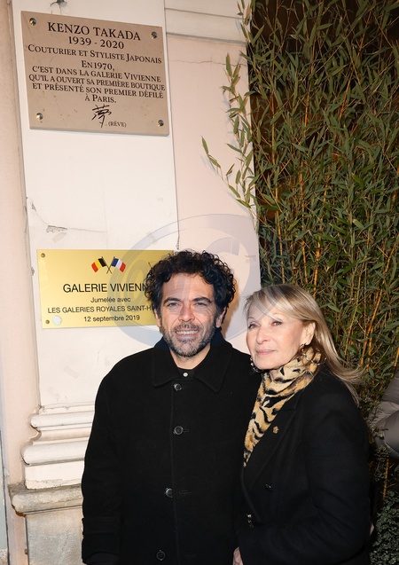 Dévoilement d'une plaque en hommage à Kenzo Takada saluant l'héritage du créateur japonais décédé en 2020 devant la Galerie Vivienne à Paris