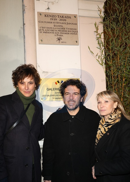 Inès de La Fressange, Sylvain Blanc (directeur de la maison Kenzo) et Ruth Obadia - Dévoilement d'une plaque en hommage à Kenzo Takada saluant l'héritage du créateur japonais décédé en 2020 devant la Galerie Vivienne à Paris le 16 janvier 2024. © Coadic Guirec/Bestimage Unveiling of a plaque in tribute to Kenzo Takada saluting the legacy of the Japanese designer who died in 2020 in front of the Galerie Vivienne in Paris on January 16, 2024.