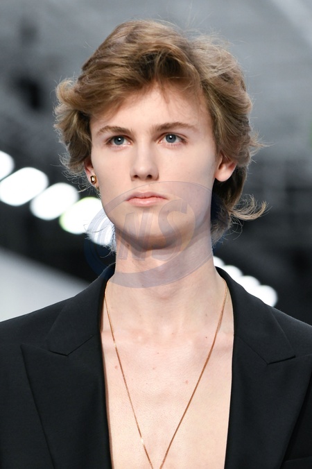DSquared2 Model On Catwalk, Men, Milan Fashion Week 2024 Man Ready To Wear For Fall Winter, Defile, Fashion Show Runway Collection, Pret A Porter, Modelwear, Modeschau, Man, Laufsteg Hebet Winter Autumn Italycloseup, accessories, details, face, hair, eyes catwalk fashion outlook beauty runway menMILMFW24, Credit:www.fashionpps.com / Avalon