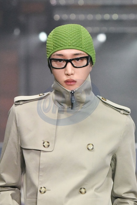 Prada Model On Catwalk, Men, Milan Fashion Week 2024 Man Ready To Wear For Fall Winter, Defile, Fashion Show Runway Collection, Pret A Porter, Modelwear, Modeschau, Man, Laufsteg Hebet Winter Autumn Italycloseup, accessories, details, face, hair, eyes catwalk fashion outlook beauty runway menMILMFW24, Credit:www.fashionpps.com / Avalon
