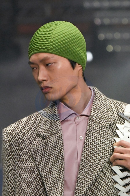 Prada Model On Catwalk, Men, Milan Fashion Week 2024 Man Ready To Wear For Fall Winter, Defile, Fashion Show Runway Collection, Pret A Porter, Modelwear, Modeschau, Man, Laufsteg Hebet Winter Autumn Italycloseup, accessories, details, face, hair, eyes catwalk fashion outlook beauty runway menMILMFW24, Credit:www.fashionpps.com / Avalon
