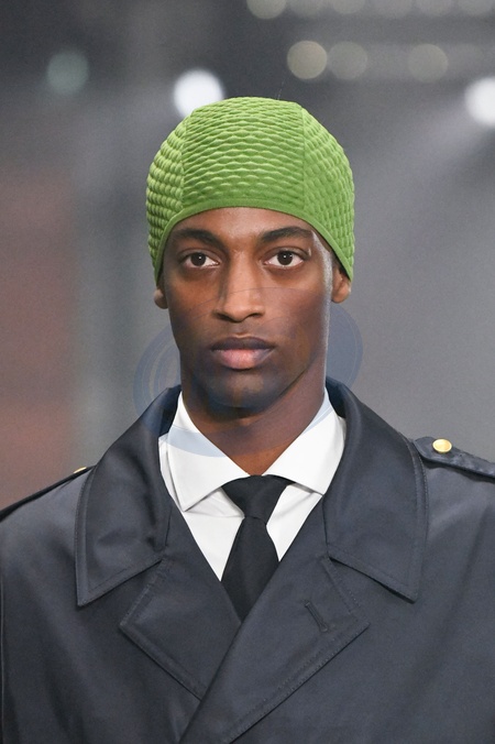 Prada Model On Catwalk, Men, Milan Fashion Week 2024 Man Ready To Wear For Fall Winter, Defile, Fashion Show Runway Collection, Pret A Porter, Modelwear, Modeschau, Man, Laufsteg Hebet Winter Autumn Italycloseup, accessories, details, face, hair, eyes catwalk fashion outlook beauty runway menMILMFW24, Credit:www.fashionpps.com / Avalon