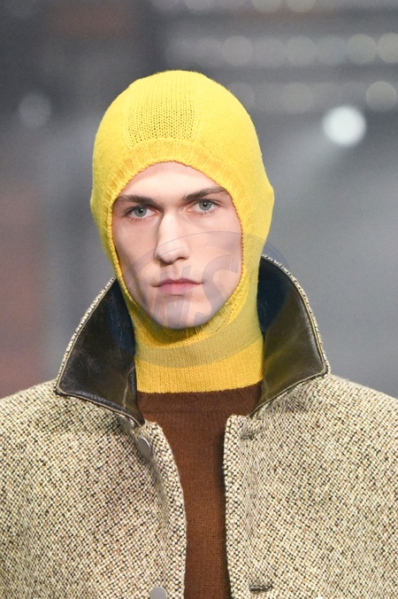 Prada Model On Catwalk, Men, Milan Fashion Week 2024 Man Ready To Wear For Fall Winter, Defile, Fashion Show Runway Collection, Pret A Porter, Modelwear, Modeschau, Man, Laufsteg Hebet Winter Autumn Italycloseup, accessories, details, face, hair, eyes catwalk fashion outlook beauty runway menMILMFW24, Credit:www.fashionpps.com / Avalon
