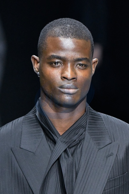 Emporio Armani Model On Catwalk, Men, Milan Fashion Week 2024 Man Ready To Wear For Fall Winter, Defile, Fashion Show Runway Collection, Pret A Porter, Modelwear, Modeschau, Man, Laufsteg Hebet Winter Autumn Italycloseup, accessories, details, face, hair, eyes catwalk fashion outlook beauty runway menMILMFW24, Credit:www.fashionpps.com / Avalon