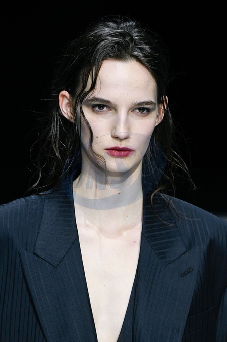 Emporio Armani Model On Catwalk, Men, Milan Fashion Week 2024 Man Ready To Wear For Fall Winter, Defile, Fashion Show Runway Collection, Pret A Porter, Modelwear, Modeschau, Man, Laufsteg Hebet Winter Autumn Italycloseup, accessories, details, face, hair, eyes catwalk fashion outlook beauty runway menMILMFW24, Credit:www.fashionpps.com / Avalon