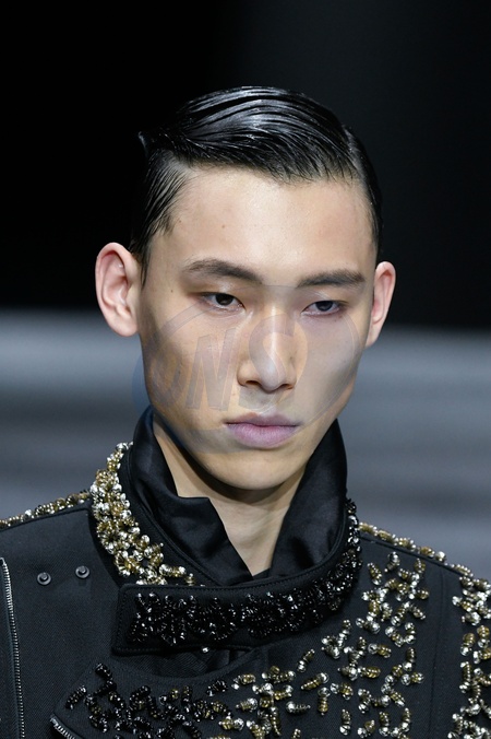Emporio Armani Model On Catwalk, Men, Milan Fashion Week 2024 Man Ready To Wear For Fall Winter, Defile, Fashion Show Runway Collection, Pret A Porter, Modelwear, Modeschau, Man, Laufsteg Hebet Winter Autumn Italycloseup, accessories, details, face, hair, eyes catwalk fashion outlook beauty runway menMILMFW24, Credit:www.fashionpps.com / Avalon