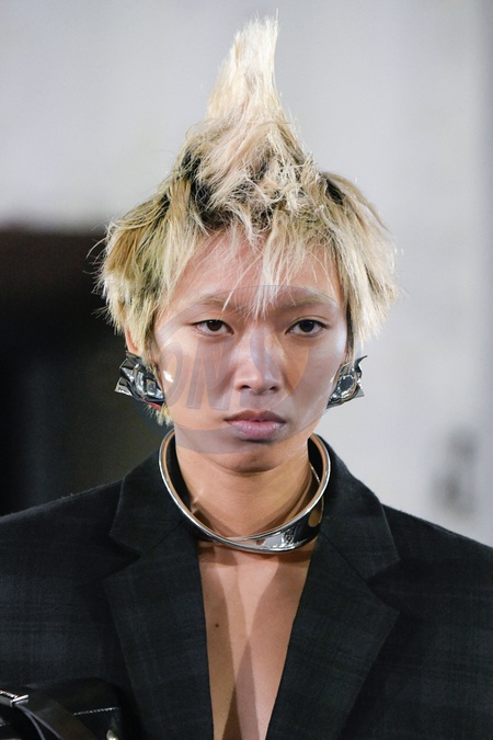 Jordan Luca Model On Catwalk, Men, Milan Fashion Week 2024 Man Ready To Wear For Fall Winter, Defile, Fashion Show Runway Collection, Pret A Porter, Modelwear, Modeschau, Man, Laufsteg Hebet Winter Autumn Italycloseup, accessories, details, face, hair, eyes catwalk fashion outlook beauty runway menMILMFW24, Credit:www.fashionpps.com / Avalon