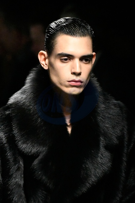 Dolce and Gabbana Model On Catwalk, Men, Milan Fashion Week 2024 Man Ready To Wear For Fall Winter, Defile, Fashion Show Runway Collection, Pret A Porter, Modelwear, Modeschau, Man, Laufsteg Hebet Winter Autumn Italycloseup, accessories, details, face, hair, eyes catwalk fashion outlook beauty runway menMILMFW24, Credit:www.fashionpps.com / Avalon