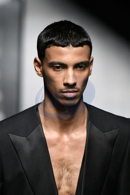 Dolce and Gabbana Model On Catwalk, Men, Milan Fashion Week 2024 Man Ready To Wear For Fall Winter, Defile, Fashion Show Runway Collection, Pret A Porter, Modelwear, Modeschau, Man, Laufsteg Hebet Winter Autumn Italycloseup, accessories, details, face, hair, eyes catwalk fashion outlook beauty runway menMILMFW24, Credit:www.fashionpps.com / Avalon