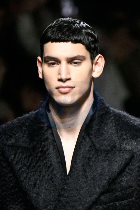 Dolce and Gabbana Model On Catwalk, Men, Milan Fashion Week 2024 Man Ready To Wear For Fall Winter, Defile, Fashion Show Runway Collection, Pret A Porter, Modelwear, Modeschau, Man, Laufsteg Hebet Winter Autumn Italycloseup, accessories, details, face, hair, eyes catwalk fashion outlook beauty runway menMILMFW24, Credit:www.fashionpps.com / Avalon