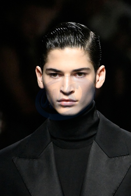 Dolce and Gabbana Model On Catwalk, Men, Milan Fashion Week 2024 Man Ready To Wear For Fall Winter, Defile, Fashion Show Runway Collection, Pret A Porter, Modelwear, Modeschau, Man, Laufsteg Hebet Winter Autumn Italycloseup, accessories, details, face, hair, eyes catwalk fashion outlook beauty runway menMILMFW24, Credit:www.fashionpps.com / Avalon