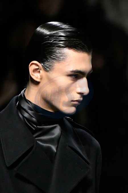 Dolce and Gabbana Model On Catwalk, Men, Milan Fashion Week 2024 Man Ready To Wear For Fall Winter, Defile, Fashion Show Runway Collection, Pret A Porter, Modelwear, Modeschau, Man, Laufsteg Hebet Winter Autumn Italycloseup, accessories, details, face, hair, eyes catwalk fashion outlook beauty runway menMILMFW24, Credit:www.fashionpps.com / Avalon