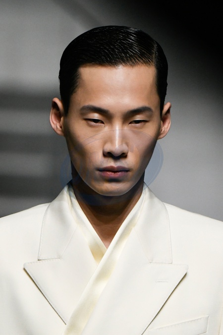 Dolce and Gabbana Model On Catwalk, Men, Milan Fashion Week 2024 Man Ready To Wear For Fall Winter, Defile, Fashion Show Runway Collection, Pret A Porter, Modelwear, Modeschau, Man, Laufsteg Hebet Winter Autumn Italycloseup, accessories, details, face, hair, eyes catwalk fashion outlook beauty runway menMILMFW24, Credit:www.fashionpps.com / Avalon