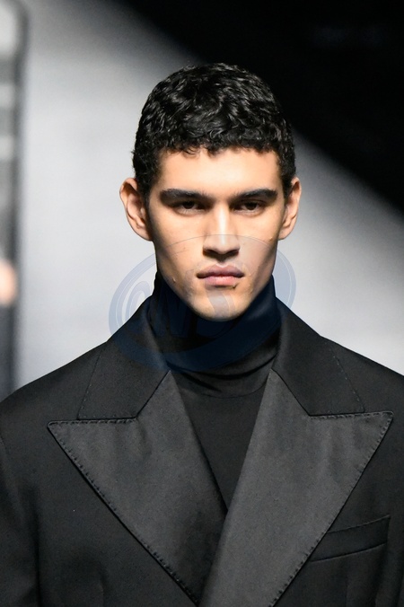 Dolce and Gabbana Model On Catwalk, Men, Milan Fashion Week 2024 Man Ready To Wear For Fall Winter, Defile, Fashion Show Runway Collection, Pret A Porter, Modelwear, Modeschau, Man, Laufsteg Hebet Winter Autumn Italycloseup, accessories, details, face, hair, eyes catwalk fashion outlook beauty runway menMILMFW24, Credit:www.fashionpps.com / Avalon