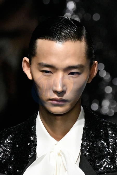 Dolce and Gabbana Model On Catwalk, Men, Milan Fashion Week 2024 Man Ready To Wear For Fall Winter, Defile, Fashion Show Runway Collection, Pret A Porter, Modelwear, Modeschau, Man, Laufsteg Hebet Winter Autumn Italycloseup, accessories, details, face, hair, eyes catwalk fashion outlook beauty runway menMILMFW24, Credit:www.fashionpps.com / Avalon
