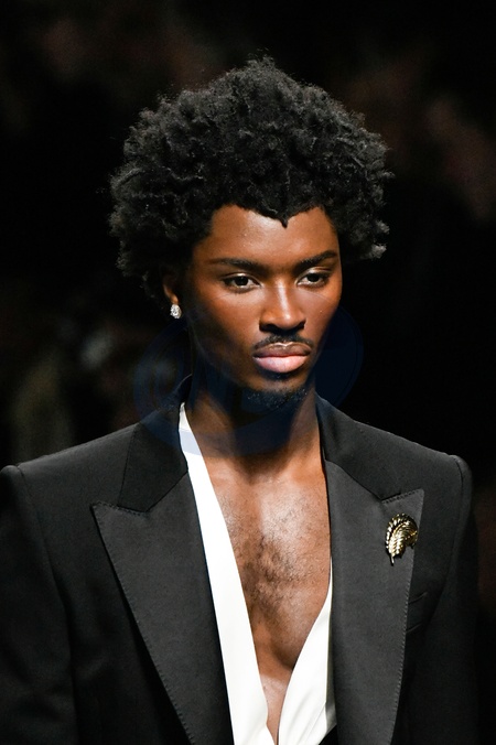 Dolce and Gabbana Model On Catwalk, Men, Milan Fashion Week 2024 Man Ready To Wear For Fall Winter, Defile, Fashion Show Runway Collection, Pret A Porter, Modelwear, Modeschau, Man, Laufsteg Hebet Winter Autumn Italycloseup, accessories, details, face, hair, eyes catwalk fashion outlook beauty runway menMILMFW24, Credit:www.fashionpps.com / Avalon