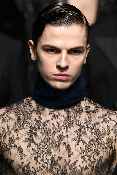 Dolce and Gabbana Model On Catwalk, Men, Milan Fashion Week 2024 Man Ready To Wear For Fall Winter, Defile, Fashion Show Runway Collection, Pret A Porter, Modelwear, Modeschau, Man, Laufsteg Hebet Winter Autumn Italycloseup, accessories, details, face, hair, eyes catwalk fashion outlook beauty runway menMILMFW24, Credit:www.fashionpps.com / Avalon