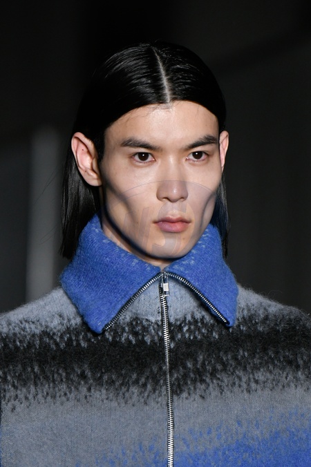 Federico Cina Model On Catwalk, Men, Milan Fashion Week 2024 Man Ready To Wear For Fall Winter, Defile, Fashion Show Runway Collection, Pret A Porter, Modelwear, Modeschau, Man, Laufsteg Hebet Winter Autumn Italycloseup, accessories, details, face, hair, eyes catwalk fashion outlook beauty runway menMILMFW24, Credit:www.fashionpps.com / Avalon