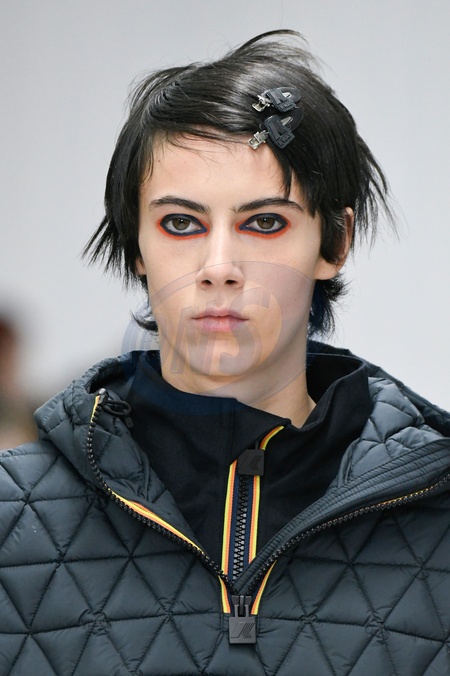 K way Model On Catwalk, Men, Milan Fashion Week 2024 Man Ready To Wear For Fall Winter, Defile, Fashion Show Runway Collection, Pret A Porter, Modelwear, Modeschau, Man, Laufsteg Hebet Winter Autumn Italycloseup, accessories, details, face, hair, eyes catwalk fashion outlook beauty runway menMILMFW24, Credit:www.fashionpps.com / Avalon