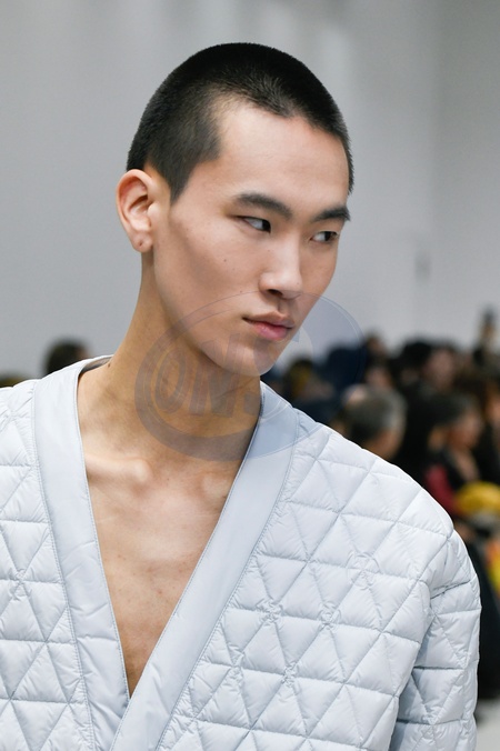 K way Model On Catwalk, Men, Milan Fashion Week 2024 Man Ready To Wear For Fall Winter, Defile, Fashion Show Runway Collection, Pret A Porter, Modelwear, Modeschau, Man, Laufsteg Hebet Winter Autumn Italycloseup, accessories, details, face, hair, eyes catwalk fashion outlook beauty runway menMILMFW24, Credit:www.fashionpps.com / Avalon