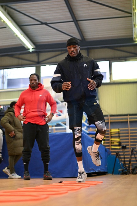 Boxer Bakary Samake trenuje w sali bokserskiej IBC w Champs sur Marne.
