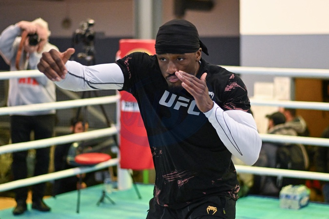 Boxer Bakary Samake trenuje w sali bokserskiej IBC w Champs sur Marne.