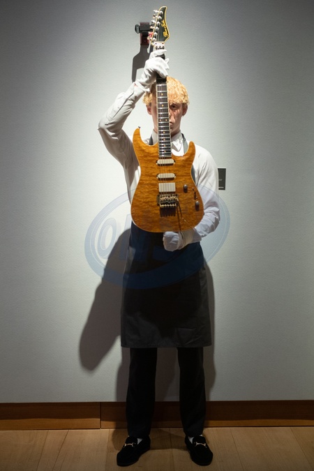 A technician holds up a '1988 Pensa-Suhr MK-1 Custom' guitar (est. £6,000 - £8,000) as part of Christie's 'The Mark Knopfler Guitar Collection' Auction on 31st January 2024 - Christie's King Street, London, England, UK on Thursday 18 January, 2024., Credit:Justin Ng / Avalon