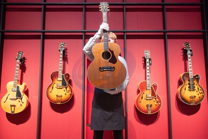 A technician holds up a 'A 1985 Gibson Nashville Tennesee J-200 anniversary guitar' (est. £5,000 - £7,000) as part of Christie's 'The Mark Knopfler Guitar Collection' Auction on 31st January 2024 - Christie's King Street, London, England, UK on Thursday 18 January, 2024., Credit:Justin Ng / Avalon