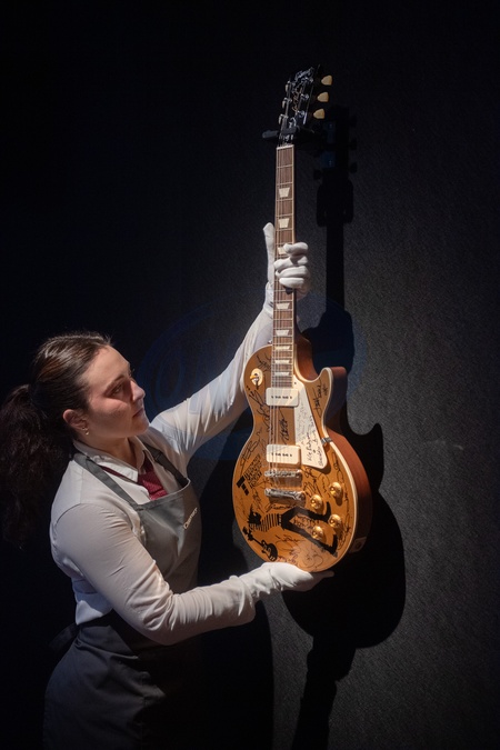 A technician holds up a '2021 Gold top Gibson Nashville Tennessee Les Paul Standard guitar' (est. £20,000 - £40,000) as part of Christie's 'The Mark Knopfler Guitar Collection' Auction on 31st January 2024 - Christie's King Street, London, England, UK on Thursday 18 January, 2024. The guitar has been signed by Mark Knopfler, Eric Clapton, Jeff Beck, David Gilmour, Pete Townshend, Roger Daltrey, Hank Marvin, Slash, Ronnie Wood, Brian May, Tony Iommi, Sting, Ringo Starr, Bruce Springsteen, The Edge, Joan Jett, Buddy Guy, Nile Rodgers, Joe Walsh, Vince Gill, Joe Bonamassa, Keith Urban, Peter Frampton, Sam Fender, Joan Armatrading, Mike Rutherford, Paul Carrack, Guy Fletcher, Steve Cropper, Duane Eddy, James Burton, Albert Lee, and Joe Brown, Credit:Justin Ng / Avalon