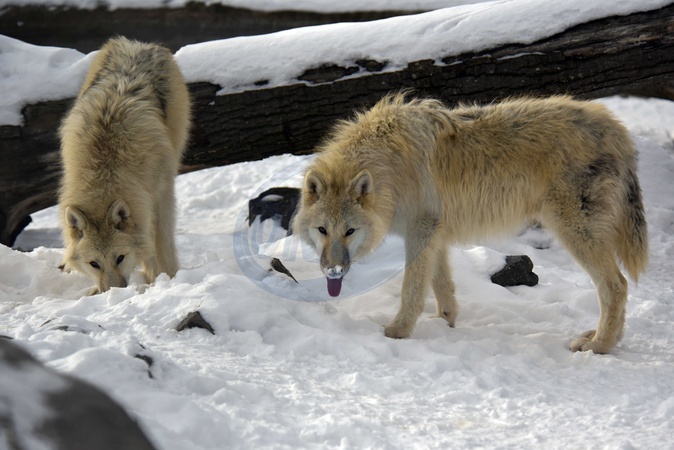 VINNYTSIA, UKRAINE - JANUARY 16, 2024 - Arctic wolves are seen in the enclosure of the Podilskyi Zoo, Vinnytsia, west-central Ukraine., Credit:Oleksandr Lapin / Avalon