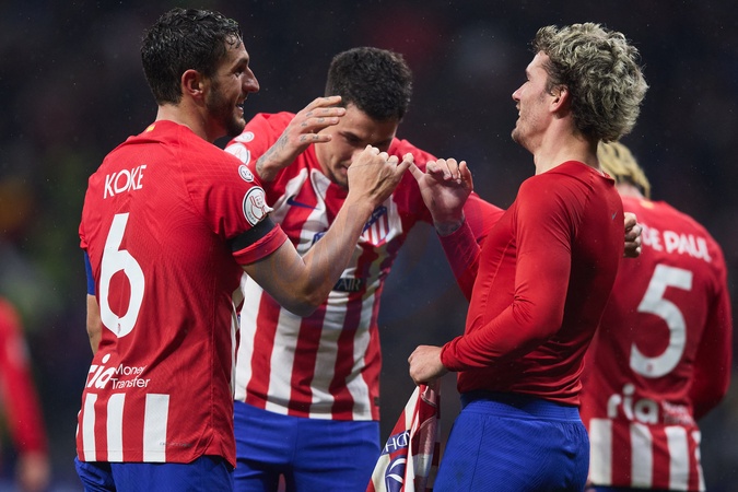 L'Atletico de Madrid bat le Real de Madrid (4-2) lors des huitièmes de finale de la Copa del Rey, la Coupe d'Espagne à Madrid le 18 janvier 2024. Koke of Atletico de Madrid (L) talks to Antoine Griezmann of Atletico de Madrid (R) during the King's Cup Quarter Final match between Atletico de Madrid and Real Madrid CF at Civitas Metropolitano on January 18, 2024 in Madrid, Spain (Photo by: Alvaro Medranda/ Panoramic)