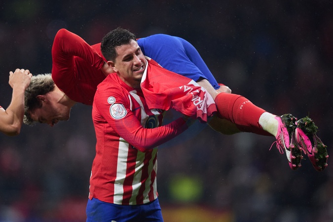 L'Atletico de Madrid bat le Real de Madrid (4-2) lors des huitièmes de finale de la Copa del Rey, la Coupe d'Espagne à Madrid le 18 janvier 2024. Jose Gimenez of Atletico de Madrid with Antoine Griezmann of Atletico de Madrid during the King's Cup Quarter Final match between Atletico de Madrid and Real Madrid CF at Civitas Metropolitano on January 18, 2024 in Madrid, Spain (Photo by: Alvaro Medranda/ Panoramic)