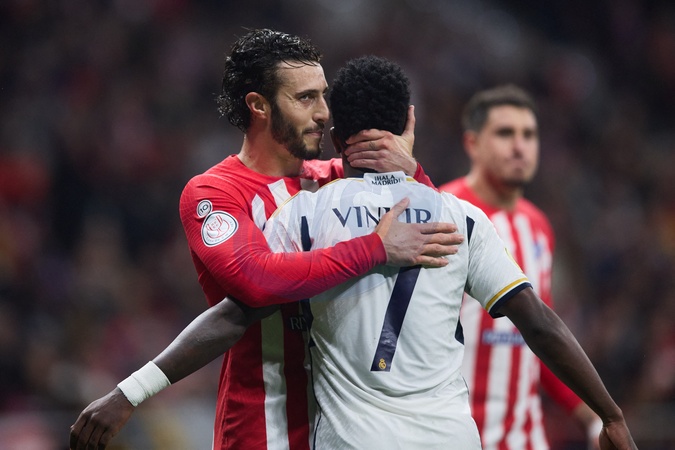 L'Atletico de Madrid bat le Real de Madrid (4-2) lors des huitièmes de finale de la Copa del Rey, la Coupe d'Espagne à Madrid le 18 janvier 2024. Mario Hermoso of Atletico de Madrid (L) talks to Vinicius Junior of Real Madrid CF (R) during the King's Cup Quarter Final match between Atletico de Madrid and Real Madrid CF at Civitas Metropolitano on January 18, 2024 in Madrid, Spain (Photo by: Alvaro Medranda/ Panoramic)