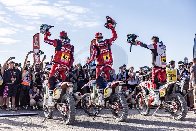 42 VAN BEVEREN Adrien (fra), Monster Energy Honda Team, Honda, 09 BRABEC Ricky (usa), Monster Energy Honda Team, Honda Moto, Motul and 46 BRANCH Ross (bwa), Hero Motorsports Team Rally, Hero, FIM W2RC, - L'Espagnol C.Sainz remporte le Dakar 2024 devant le Belge G.De Mevius et le Français S.Loeb à Yanbu (Arabie Saoudite), le 19 janvier 2024. © Florent Gooden / Panoramic / Bestimage The Spanish C.Sainz wins the 2024 Dakar ahead of the Belgian G.de Mevius and the Frenchman S.Loeb in Yanbu (Saudi Arabia), January 19th, 2024.