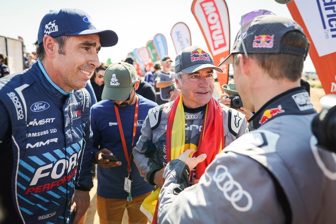 ROMA Nani (spa), Ford M-Sport World Rally Team, Ford Ranger, FIA Ultimate, SAINZ Carlos (spa), Team Audi Sport, Audi RS Q E-Tron E2, FIA Ultimate, FIA W2RC, EKSTROM Mattias (swe), Team Audi Sport, Audi RS Q E-Tron E2, FIA Ultimate, FIA W2RC, - L'Espagnol C.Sainz remporte le Dakar 2024 devant le Belge G.De Mevius et le Français S.Loeb à Yanbu (Arabie Saoudite), le 19 janvier 2024. © Antonin Vincent / Panoramic / Bestimage The Spanish C.Sainz wins the 2024 Dakar ahead of the Belgian G.de Mevius and the Frenchman S.Loeb in Yanbu (Saudi Arabia), January 19th, 2024.