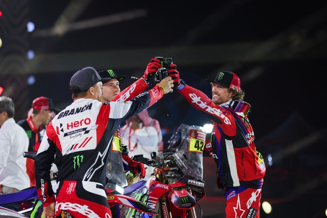 BRABEC Ricky (usa), Monster Energy Honda Team, Honda, Motul, Moto, FIM W2RC, BRANCH Ross (bwa), Hero Motorsports Team Rally, Hero, Motul, Moto, FIM W2RC, VAN BEVEREN Adrien (fra), Monster Energy Honda Team, Honda, Moto, Motul, FIM W2RC, portrait during the Final Podium of the Dakar 2024 on January 19, 2024 in Yanbu, Saudi Arabia. © DPPI/Panoramic/Bestimage