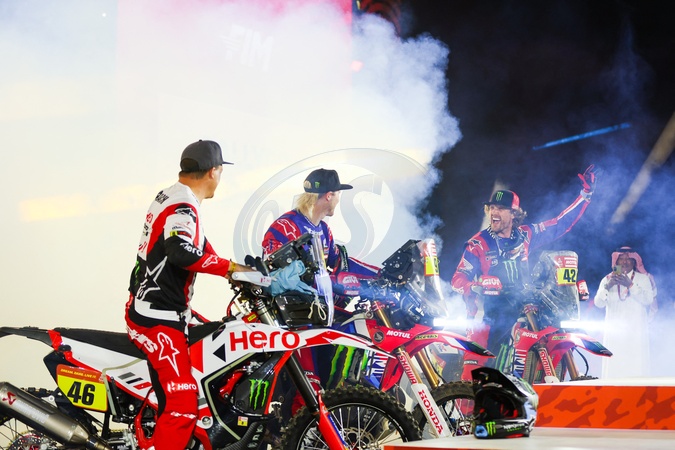 BRABEC Ricky (usa), Monster Energy Honda Team, Honda, Motul, Moto, FIM W2RC, BRANCH Ross (bwa), Hero Motorsports Team Rally, Hero, Motul, Moto, FIM W2RC, VAN BEVEREN Adrien (fra), Monster Energy Honda Team, Honda, Moto, Motul, FIM W2RC, portrait during the Final Podium of the Dakar 2024 on January 19, 2024 in Yanbu, Saudi Arabia. © DPPI/Panoramic/Bestimage