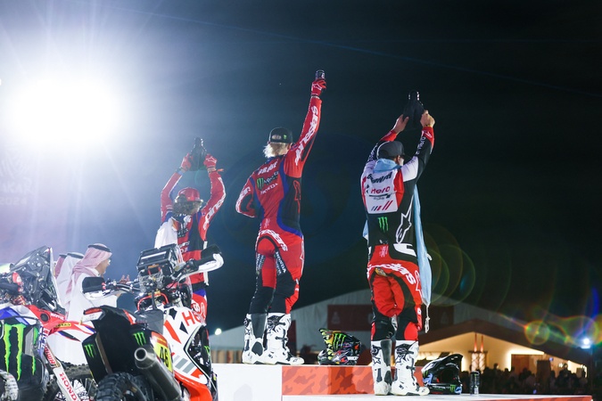 BRABEC Ricky (usa), Monster Energy Honda Team, Honda, Motul, Moto, FIM W2RC, BRANCH Ross (bwa), Hero Motorsports Team Rally, Hero, Motul, Moto, FIM W2RC, VAN BEVEREN Adrien (fra), Monster Energy Honda Team, Honda, Moto, Motul, FIM W2RC, portrait during the Final Podium of the Dakar 2024 on January 19, 2024 in Yanbu, Saudi Arabia. © DPPI/Panoramic/Bestimage