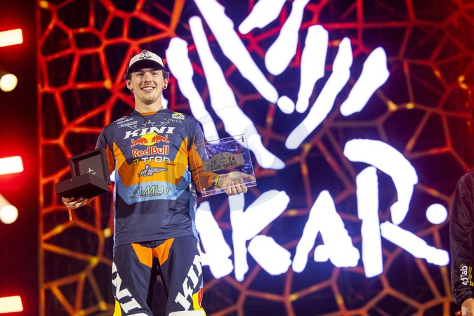 EBSTER Tobias (aut), Kini Rally Racing Team, KTM, Moto, Originals by Motul, FIM W2RC, portrait during the Final Podium of the Dakar 2024 on January 19, 2024 in Yanbu, Saudi Arabia. © DPPI/Panoramic/Bestimage