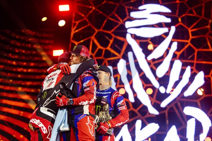 BRANCH Ross (bwa), Hero Motorsports Team Rally, Hero, Motul, Moto, FIM W2RC, VAN BEVEREN Adrien (fra), Monster Energy Honda Team, Honda, Moto, Motul, FIM W2RC, BRABEC Ricky (usa), Monster Energy Honda Team, Honda, Motul, Moto, FIM W2RC, portrait during the Final Podium of the Dakar 2024 on January 19, 2024 in Yanbu, Saudi Arabia. © DPPI/Panoramic/Bestimage