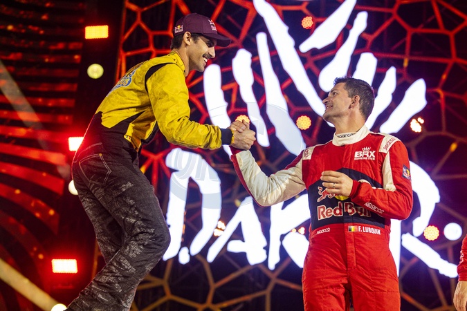 DE MEVIUS Guillaume (bel), Overdrive Racing, Toyota Hilux, FIA Ultimate, 203 LOEB Sébastien (fra), LURQUIN Fabian (bel), Bahrain Raid Xtreme, Prodrive Hunter, FIA Ultimate, portrait during the Final Podium of the Dakar 2024 on January 19, 2024 in Yanbu, Saudi Arabia. © DPPI/Panoramic/Bestimage