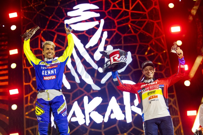 KOITHA VEETTIL Harith Noah (ind), Sherco Factory, Sherco, Motul, Moto, FIM W2RC, COX Bradley (zaf), BAS World KTM Racing Team, KTM, Moto, FIM W2RC, portrait during the Final Podium of the Dakar 2024 on January 19, 2024 in Yanbu, Saudi Arabia. © DPPI/Panoramic/Bestimage