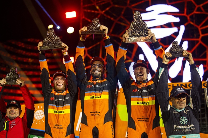 601 MACIK Martin (cze), TOMASEK Frantisek (cze), SVANDA David (cze), MM Technology Team, Iveco Powerstar, FIA Truck, portrait during the Final Podium of the Dakar 2024 on January 19, 2024 in Yanbu, Saudi Arabia. © DPPI/Panoramic/Bestimage