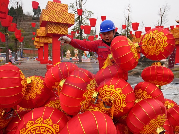 A worker puts up lanterns in a park for the upcoming Spring Festival in Suining in southwest China's Sichuan province Friday, Jan. 19, 2024., Credit:ZHONG MIN / Avalon
