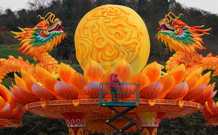 A worker installs a giant dragon lantern for the upcoming Spring Festival in Suining in southwest China's Sichuan province Friday, Jan. 19, 2024., Credit:ZHONG MIN / Avalon