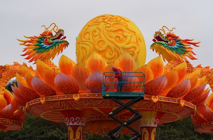 A worker installs a giant dragon lantern for the upcoming Spring Festival in Suining in southwest China's Sichuan province Friday, Jan. 19, 2024., Credit:ZHONG MIN / Avalon