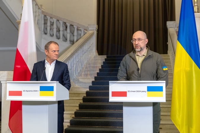 KYIV, UKRAINE - JANUARY 22, 2024 - Ukrainian Prime Minister Denys Shmyhal (R) and Polish Prime Minister Donald Tusk are pictured during a joint briefing, Kyiv, capital of Ukraine, Credit:Pavlo Bahmut / Avalon